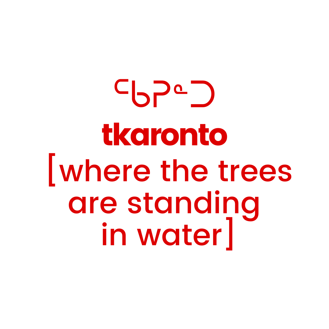 "Toronto" comes from the Mohawk word "Tkaronto" - which means where the tree's are standing in the water.